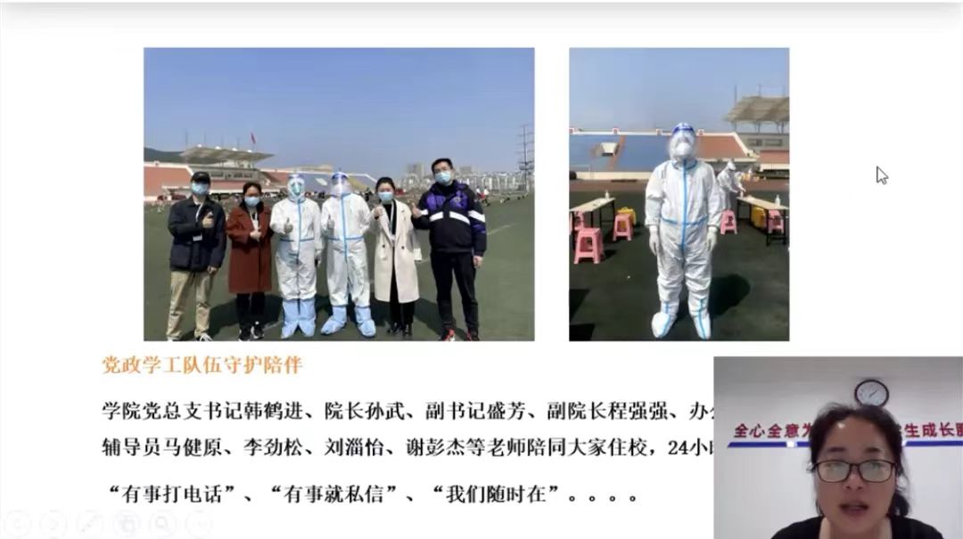 贴心呵护,心理陪伴。根据封校初期学生不适应、吐槽多等阶段性特征,她组织“共抗疫情,你我同行”线上主题班会大课,向同学们介绍徐州市疫情防控局面、HJC黄金城疫情防控工作情况、疫情防控期间校园管理规定、学生在校(居家/集中隔离)学习生活健康指南,从疫情期间心理健康关怀、校园生活温馨提醒、防范电信网络诈骗等方面给同学们做细致讲解,增强同学们的疫情防护意识,坚定大家战胜疫情的信心和决心。
